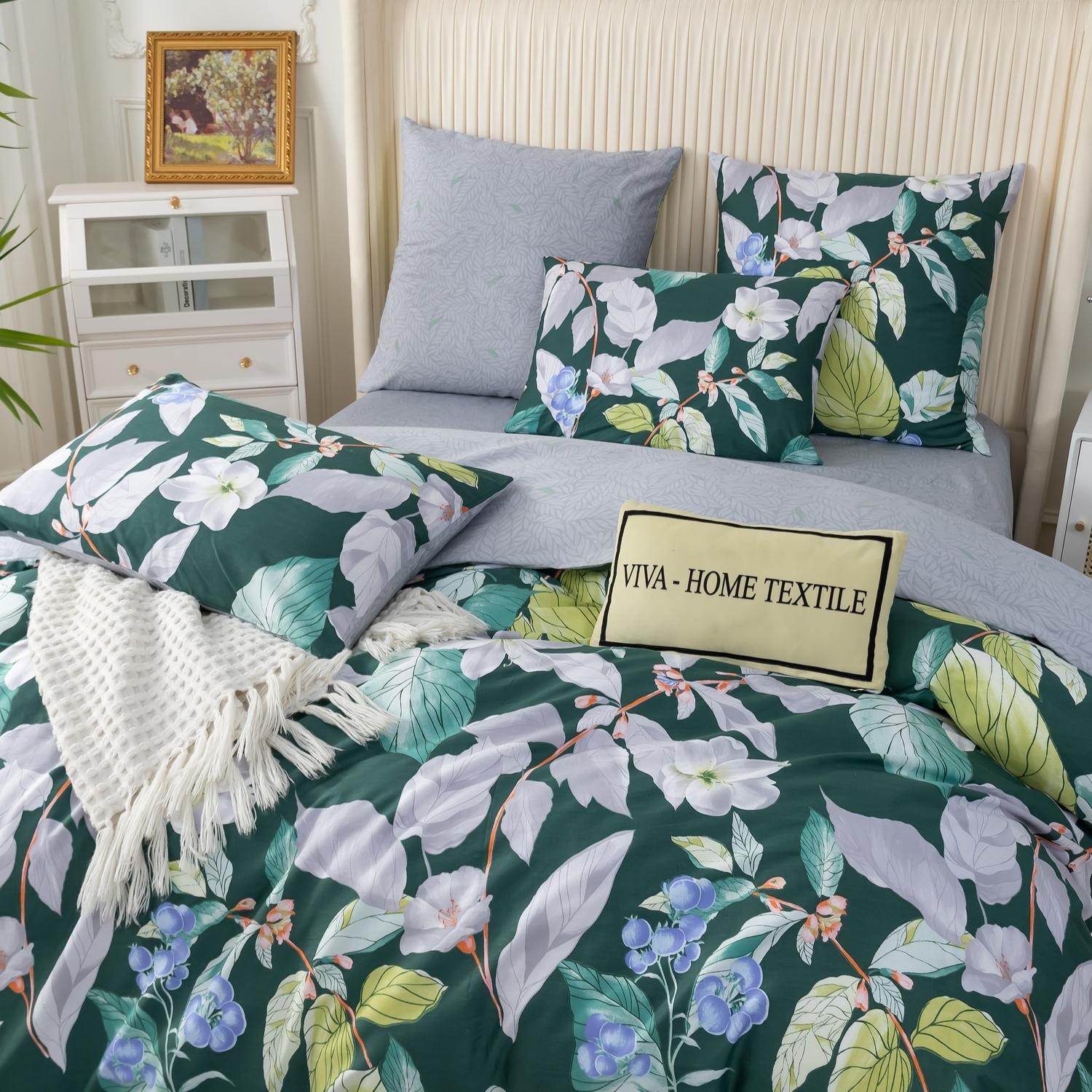 Ткань компаньон: Наволочки с разных сторон разной расцветки, пододеяльник с разных сторон разного цвета, простыня такого же цвета, как низ пододеяльника.