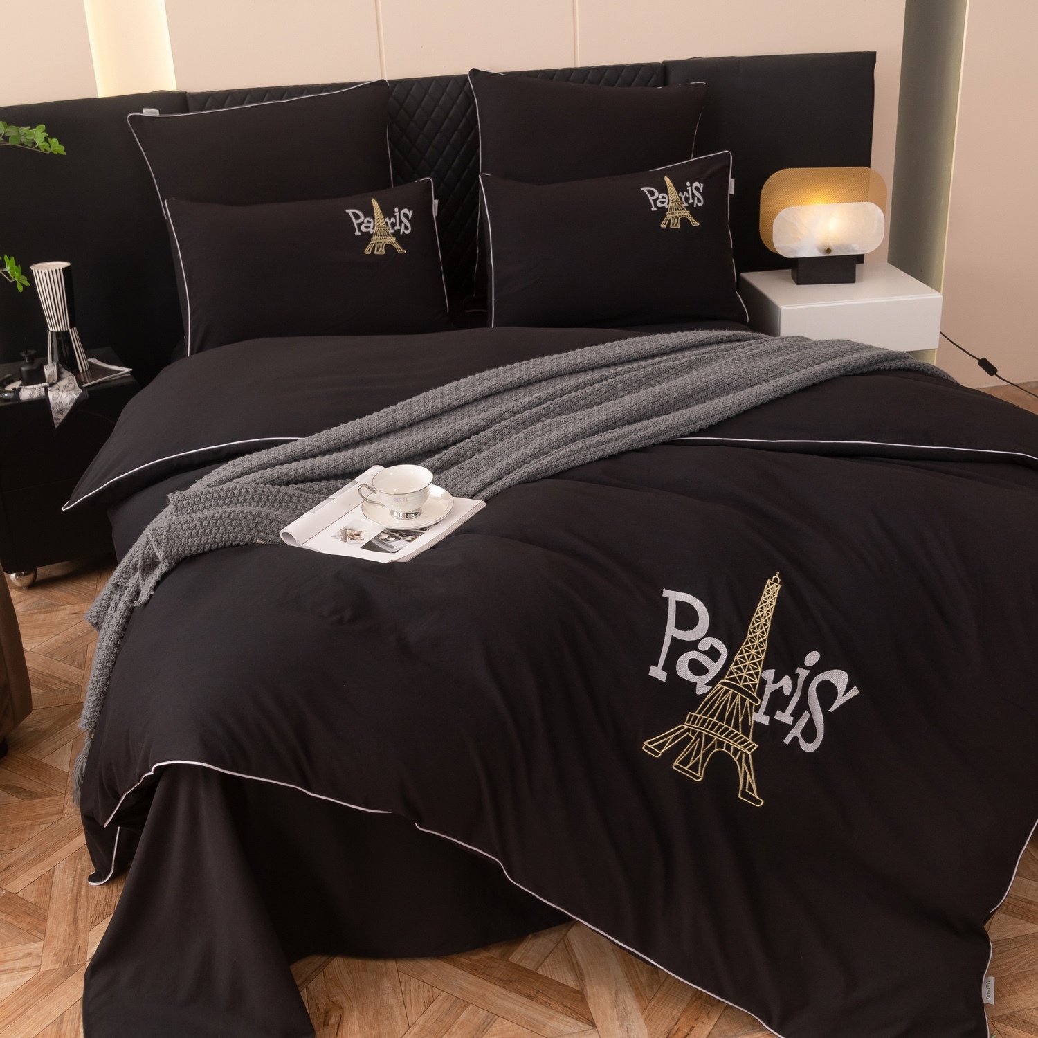 Элегантная вышивка с изображением Эйфелевой башни и надписью Paris придает дизайну неповторимый шарм, а изящный кант по периметру деликатно подчеркивает утонченность и изысканность каждого комплекта.