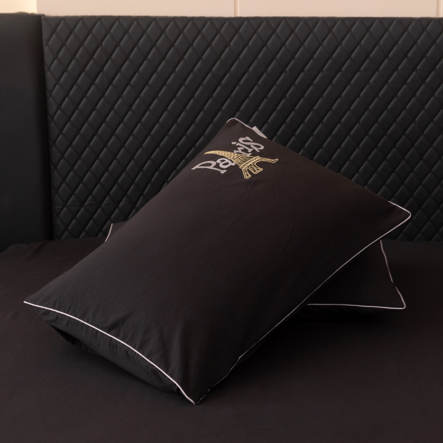 Элегантная вышивка с изображением Эйфелевой башни и надписью Paris придает дизайну неповторимый шарм, а изящный кант по периметру деликатно подчеркивает утонченность и изысканность каждого комплекта.