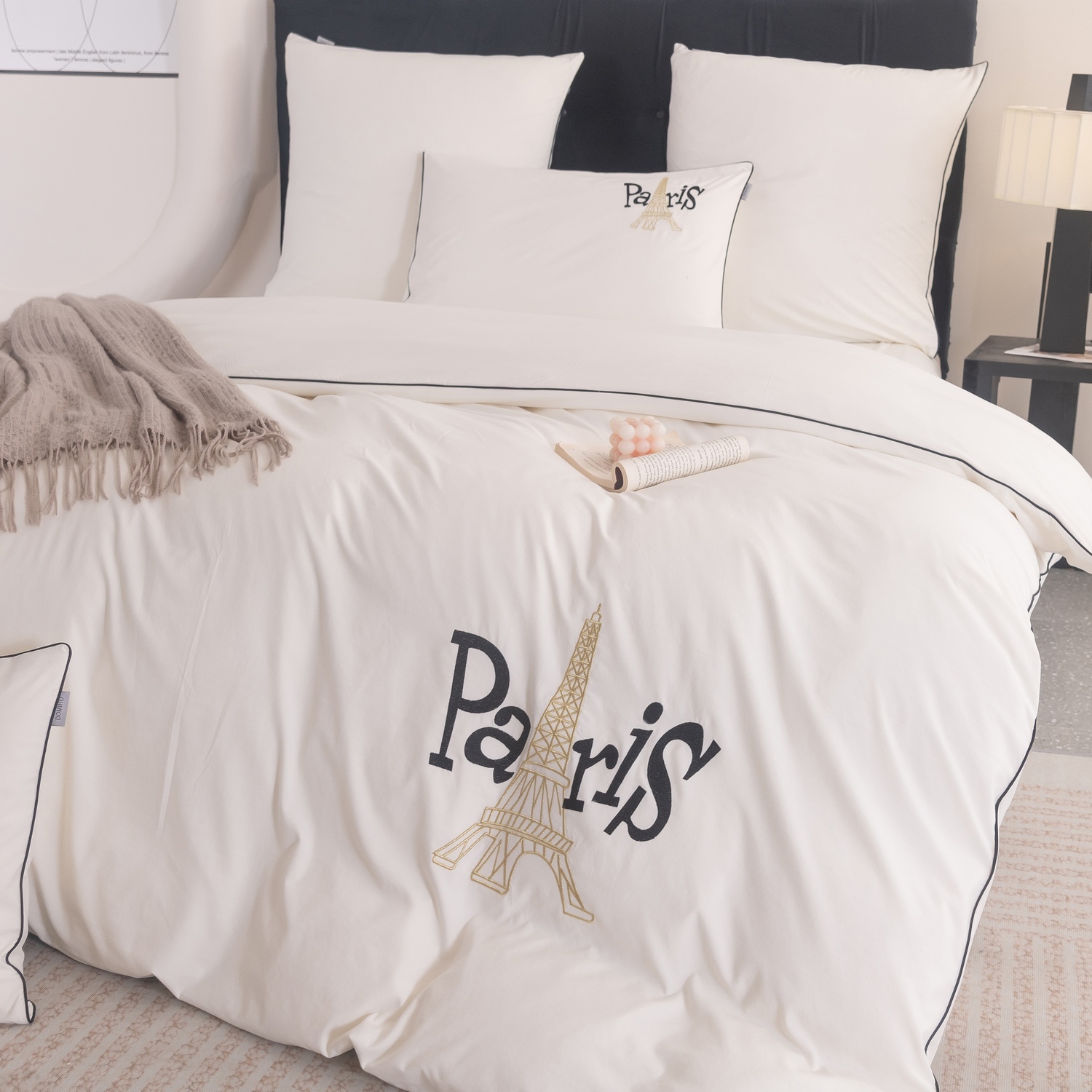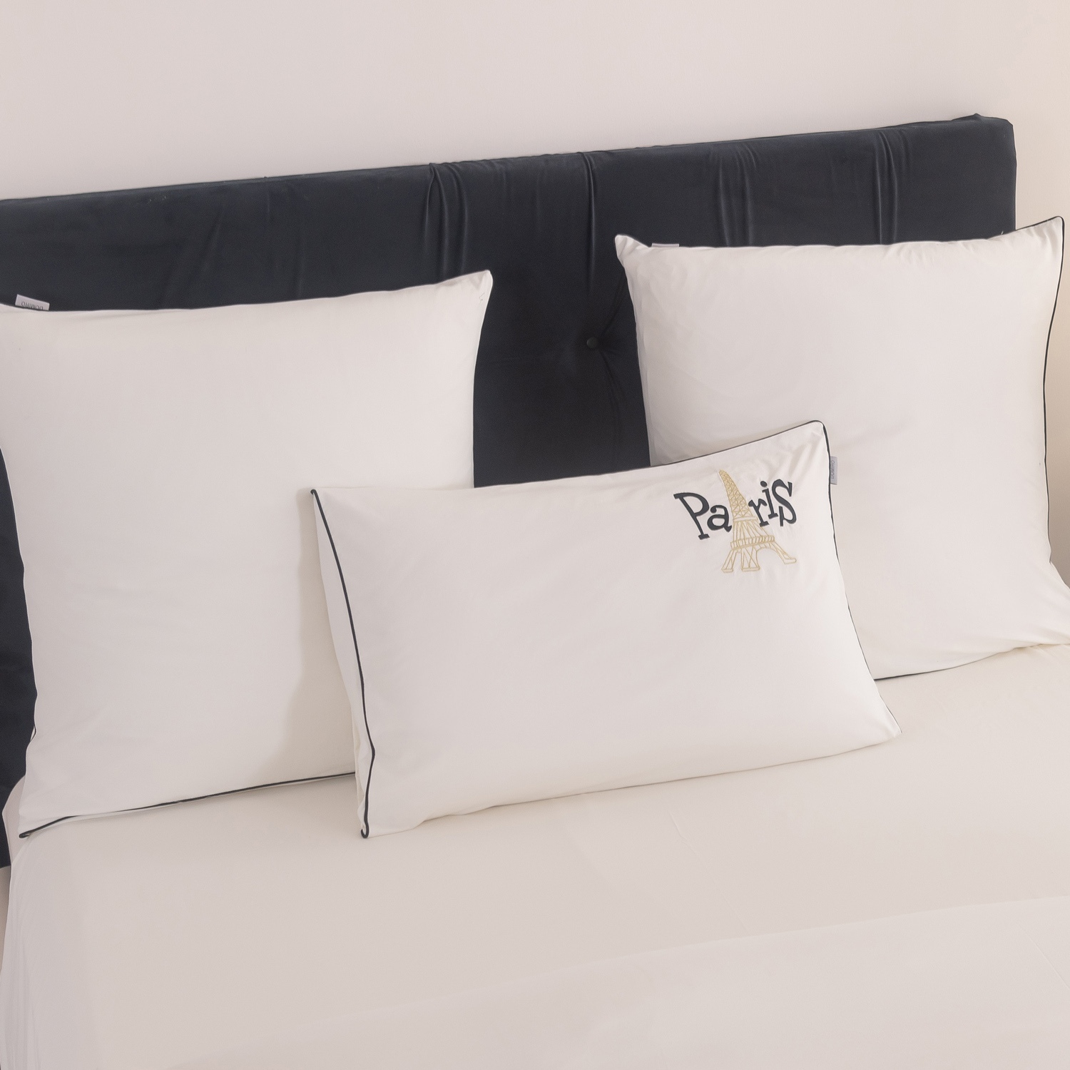 Элегантная вышивка с изображением Эйфелевой башни и надписью Paris придает дизайну неповторимый шарм, а изящный кант по периметру деликатно подчеркивает утонченность и изысканность каждого комплекта.