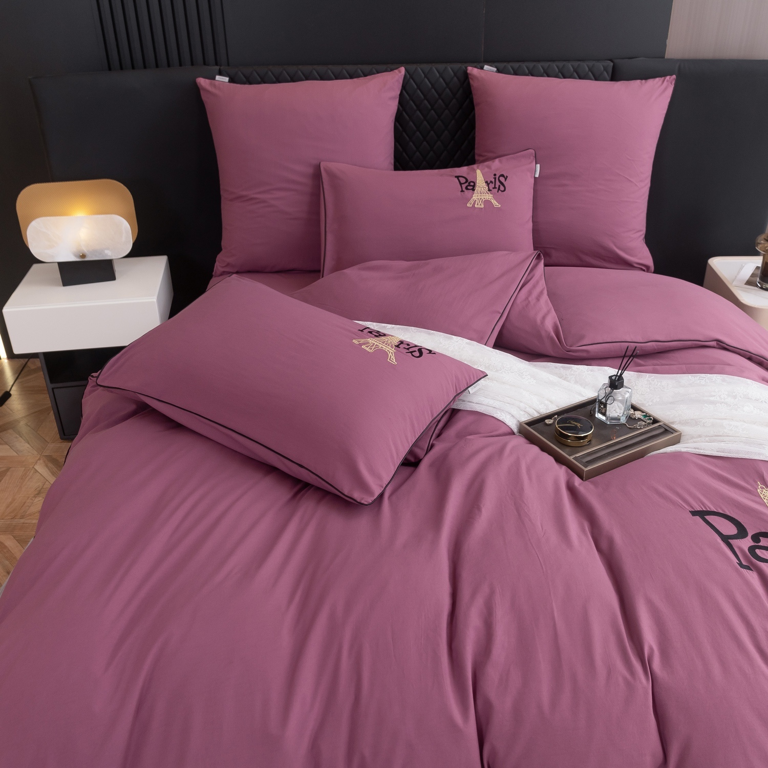 Элегантная вышивка с изображением Эйфелевой башни и надписью Paris придает дизайну неповторимый шарм, а изящный кант по периметру деликатно подчеркивает утонченность и изысканность каждого комплекта.