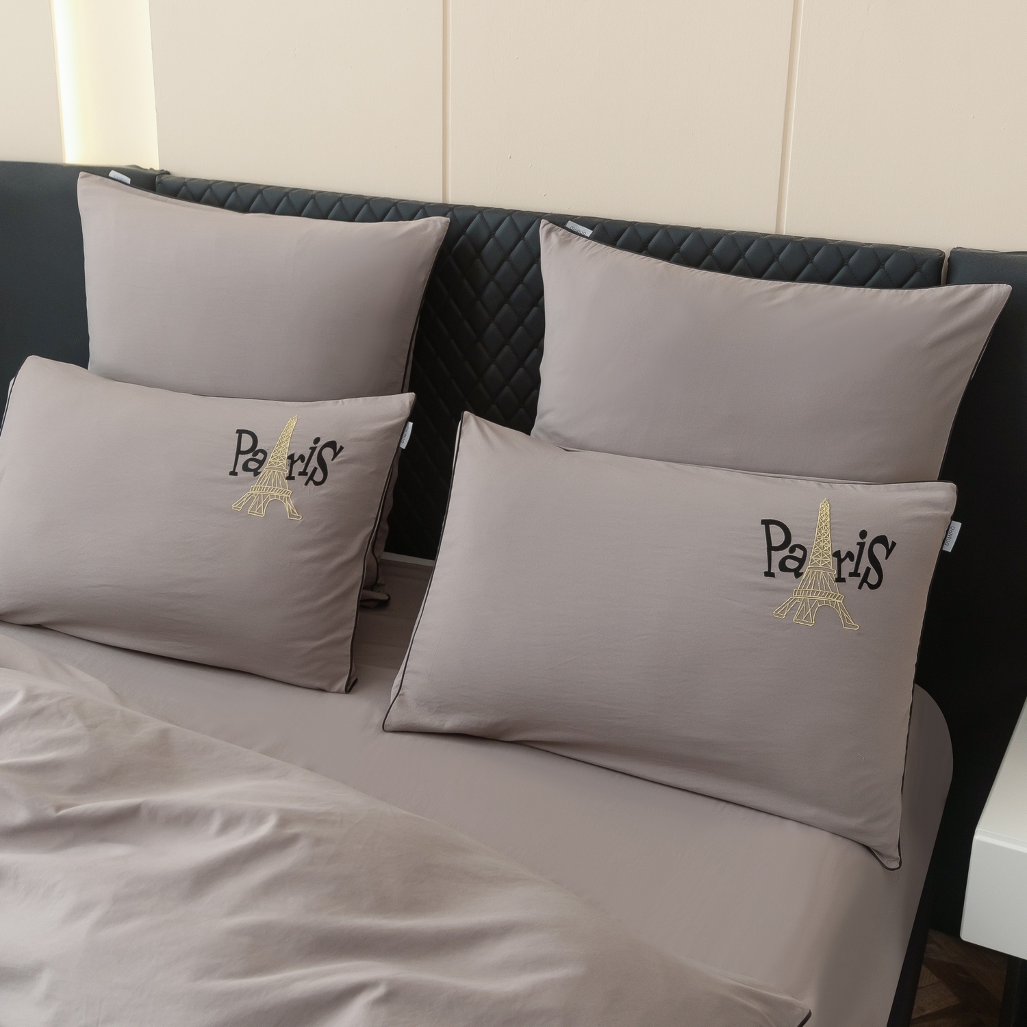 Элегантная вышивка с изображением Эйфелевой башни и надписью Paris придает дизайну неповторимый шарм, а изящный кант по периметру деликатно подчеркивает утонченность и изысканность каждого комплекта.