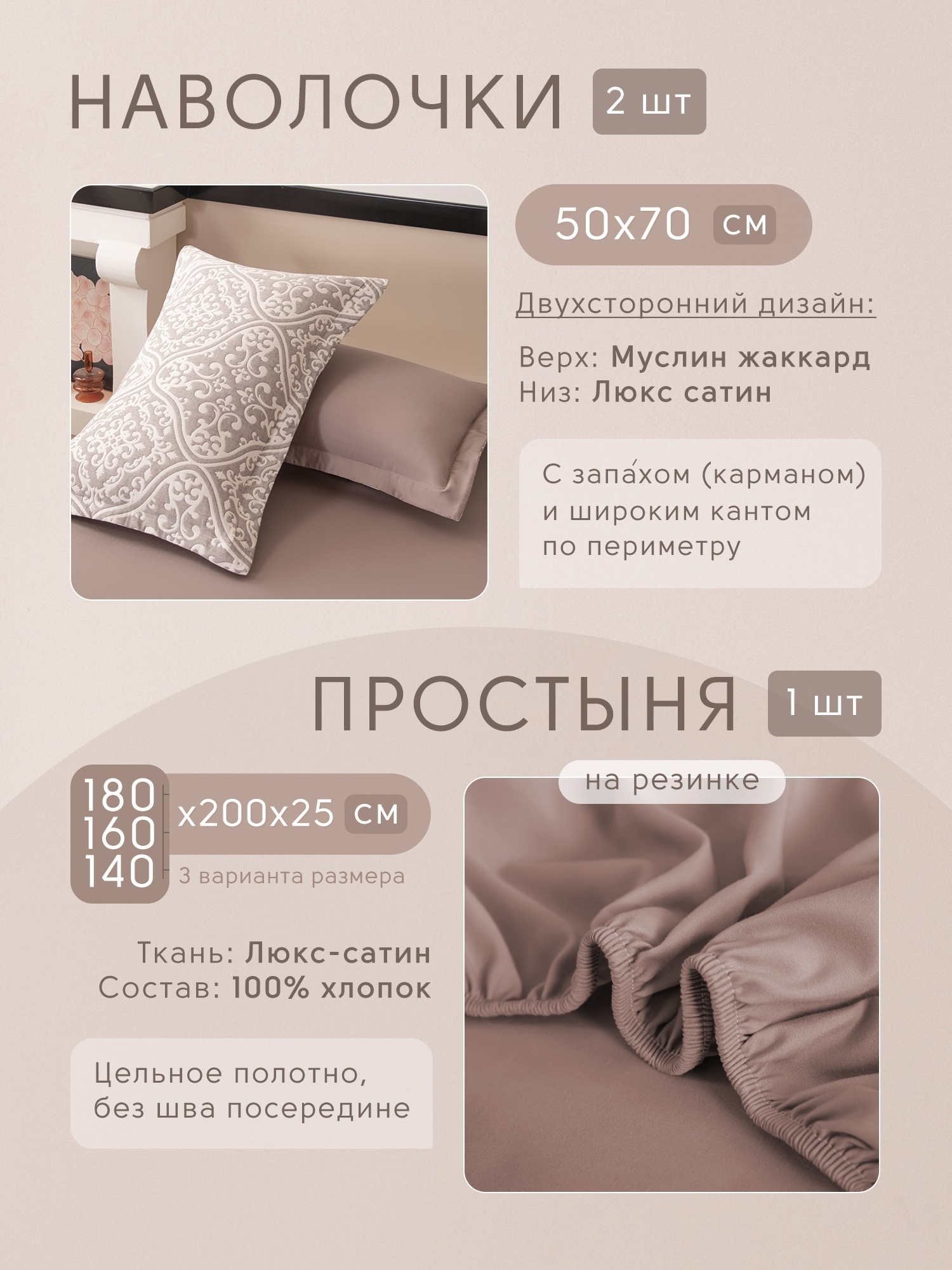 В комплект также входит однотонная простыня из люкс-сатина и две двусторонние наволочки  с широким кантом по периметру. Одна сторона наволочек выполнена из жаккардового муслина с тем же изящным узором, что и покрывало, другая — из гладкого люкс-сатина, что дает возможность комбинировать и создавать новые вариации оформления постели.