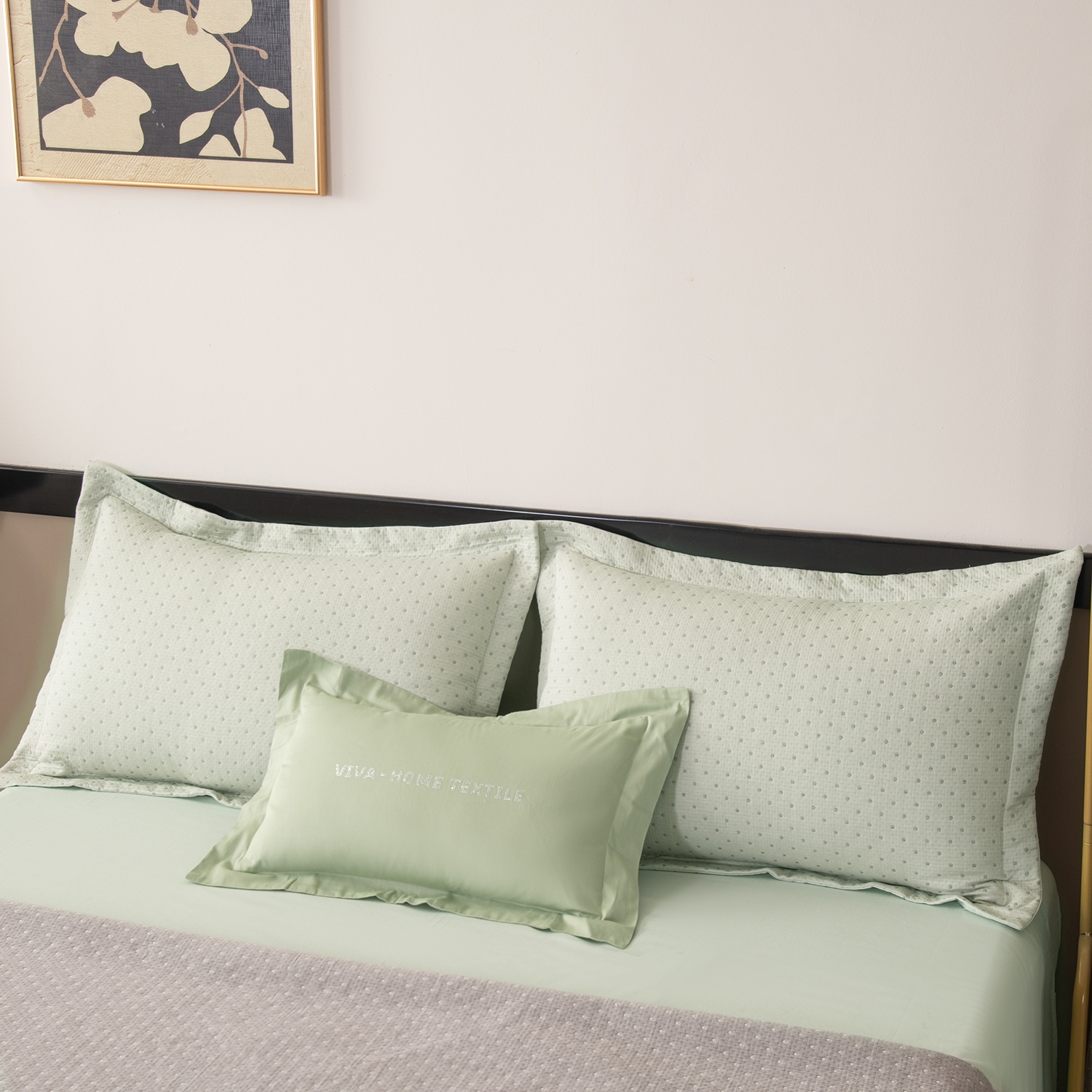 Покрывало из жаккардового муслина с декоративной простёжкой образует утонченный рельефный узор. Ткань отличается мягкостью, лёгким благородным блеском и изысканной текстурой. Дополняет композицию широкий кант в тон простыни, который гармонично объединяет все элементы комплекта.