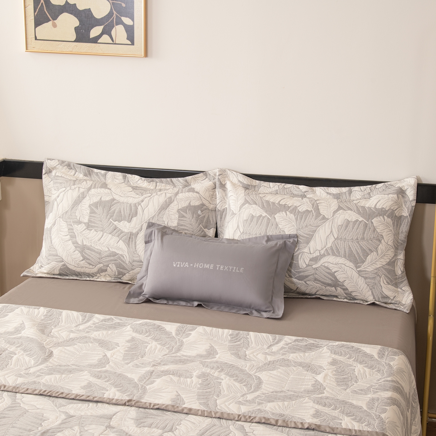 Покрывало из жаккардового муслина с декоративной простёжкой образует утонченный рельефный узор. Ткань отличается мягкостью, лёгким благородным блеском и изысканной текстурой. Дополняет композицию широкий кант в тон простыни, который гармонично объединяет все элементы комплекта.