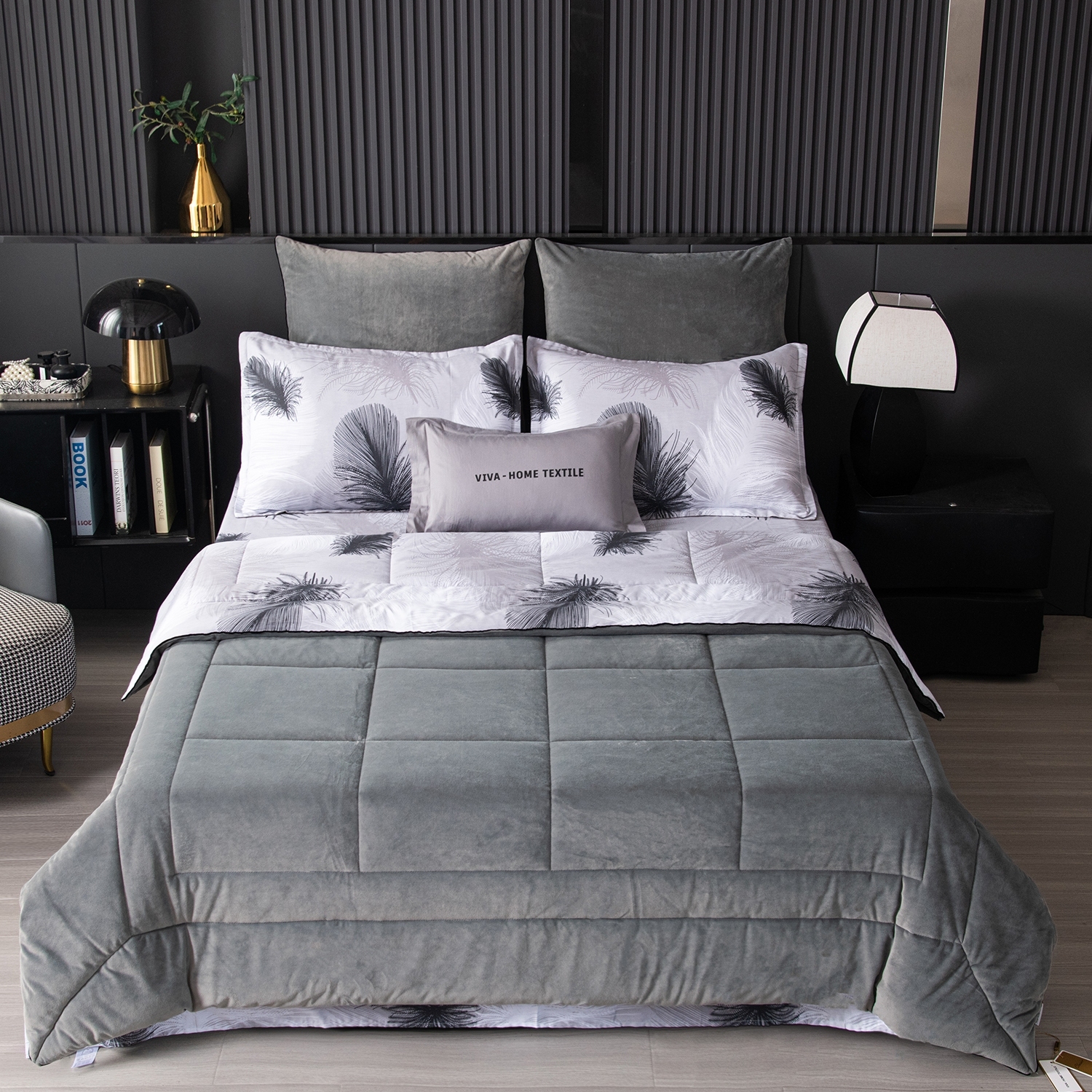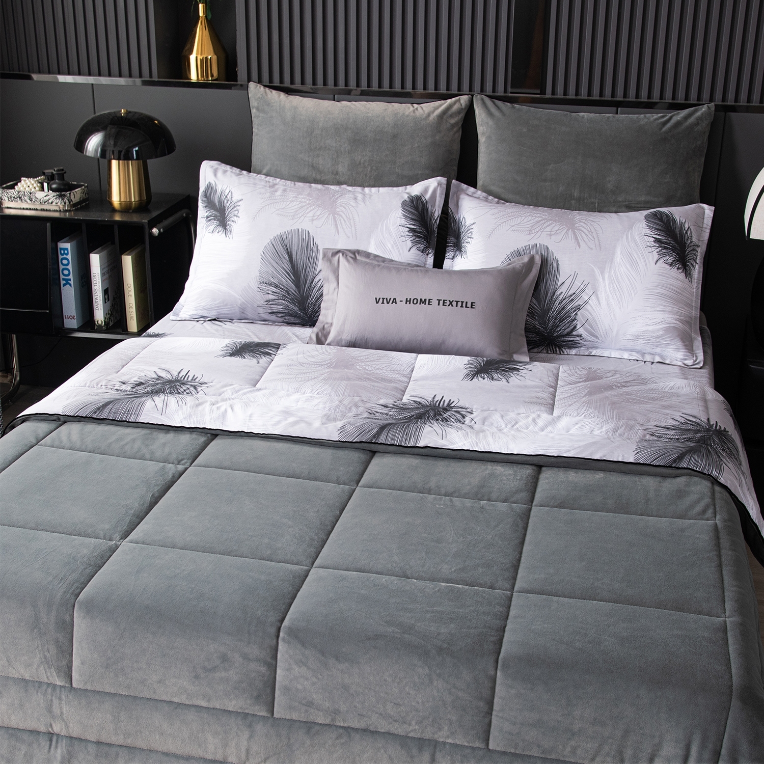 • Элегантность и уют: Одеяло украшено изысканной геометрической стёжкой и бархатным кантом. Верхняя сторона мягкий велюр, придает комплекту благородный вид, а нижняя — 100% хлопковый сатин, отлично пропускает воздух и дарит комфорт во время сна.