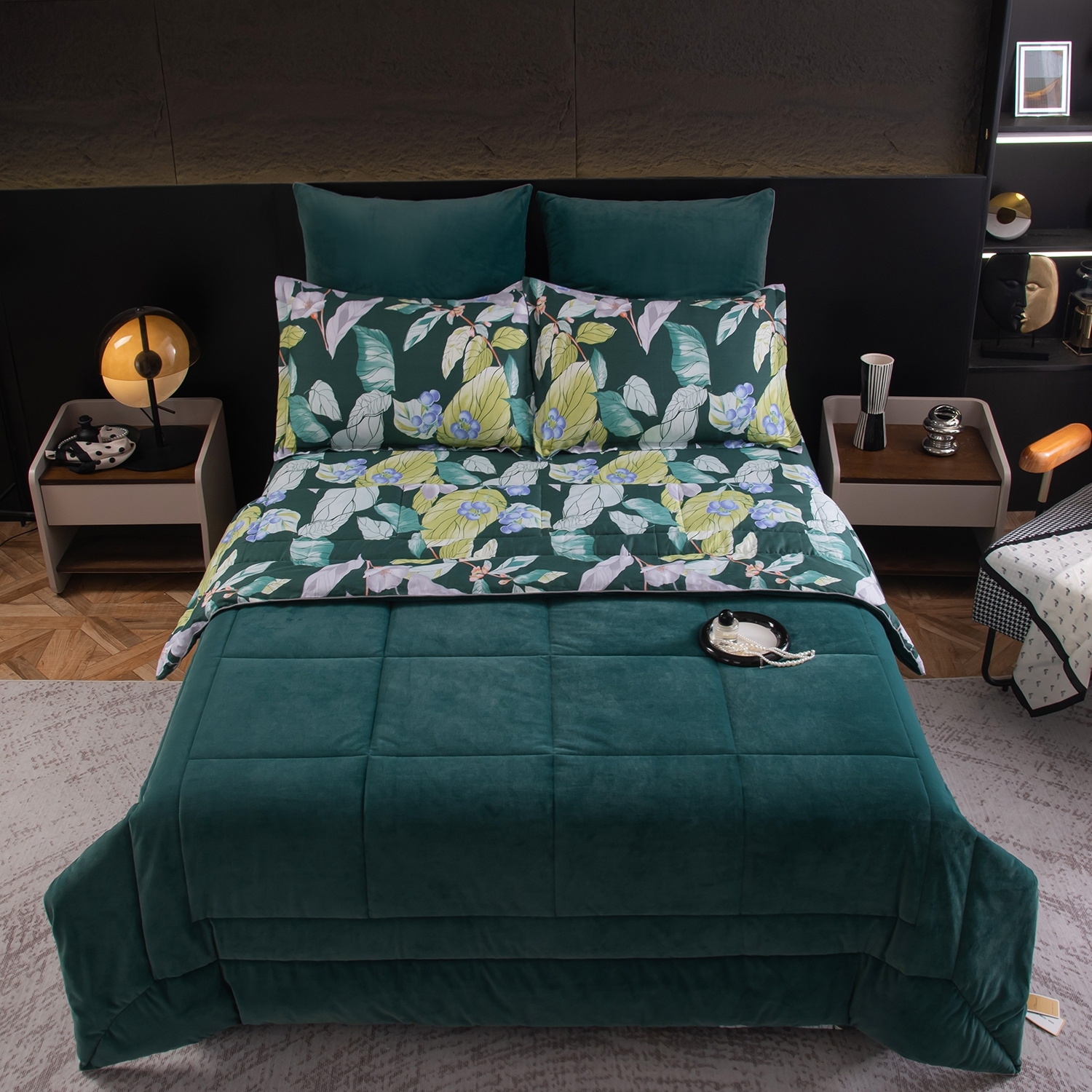• Элегантность и уют: Одеяло украшено изысканной геометрической стёжкой и бархатным кантом. Верхняя сторона мягкий велюр, придает комплекту благородный вид, а нижняя — 100% хлопковый сатин, отлично пропускает воздух и дарит комфорт во время сна.