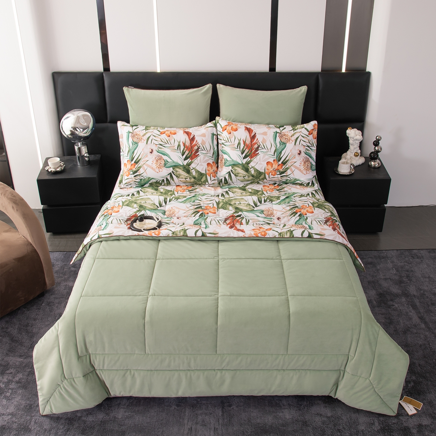 Стеганое одеяло-покрывало идеально сочетается с дизайном белья и входит в комплект, избавляя вас от лишних хлопот.