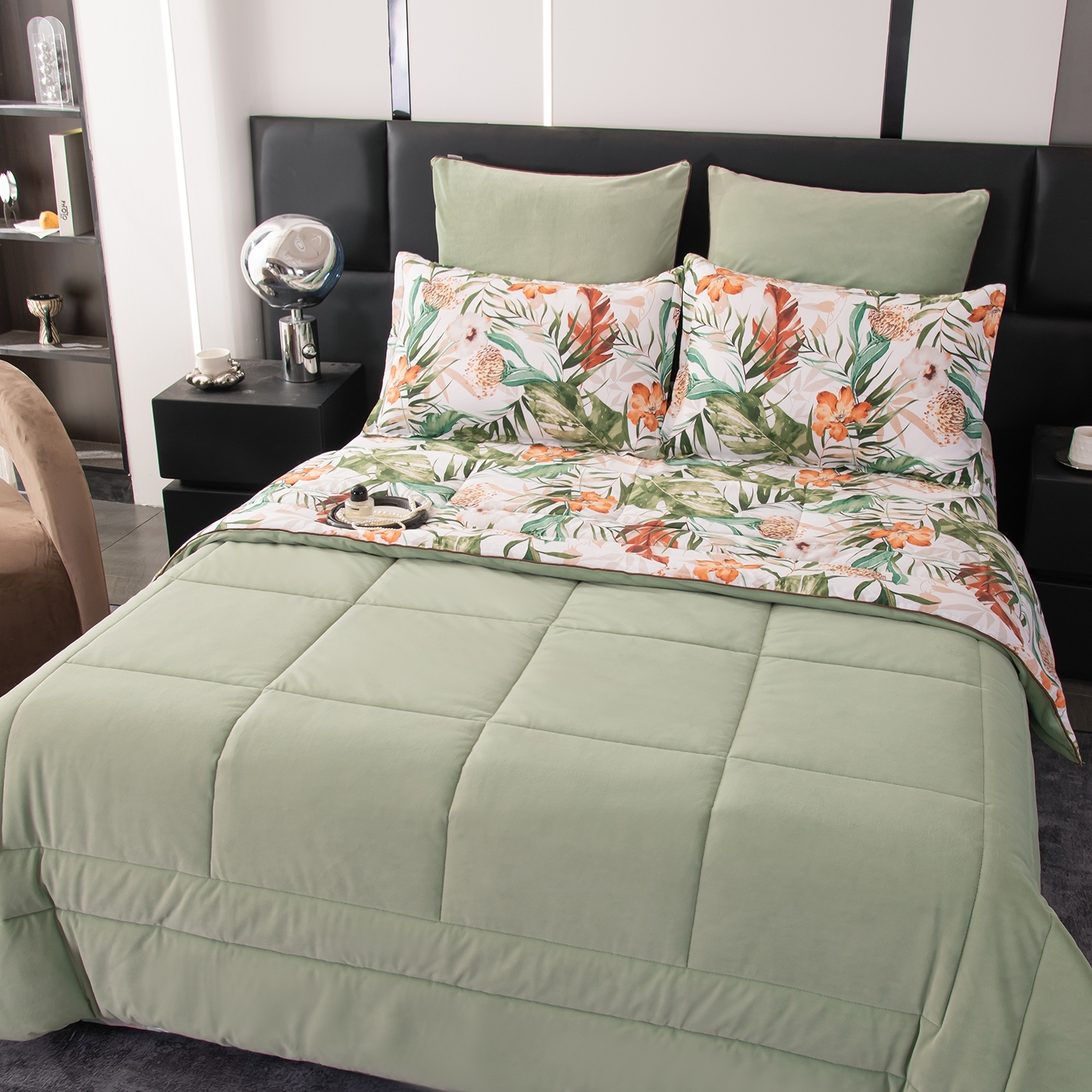Стеганое одеяло-покрывало идеально сочетается с дизайном белья и входит в комплект, избавляя вас от лишних хлопот.