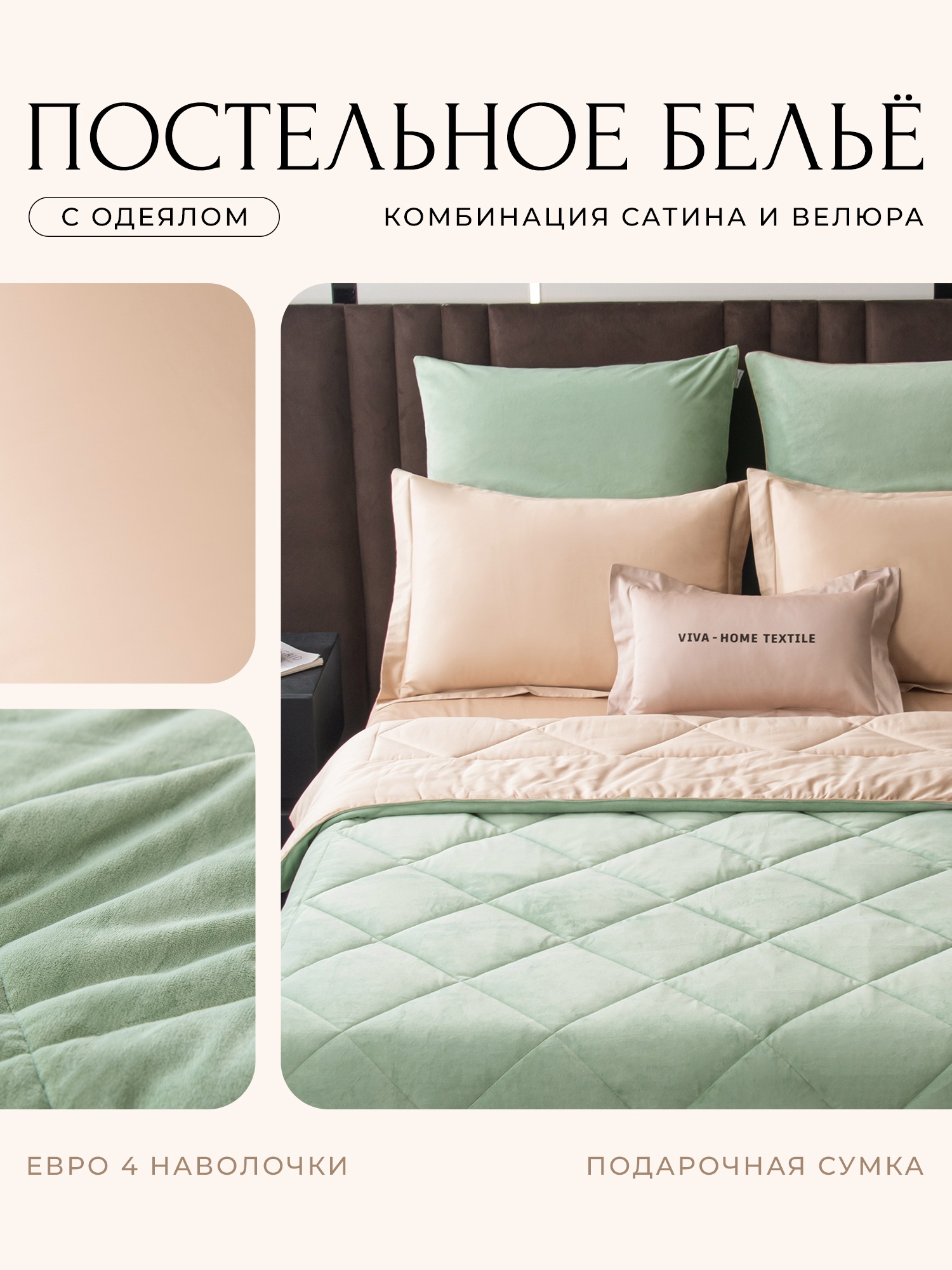 КПБ на резинке Сатин Velvet Premium с Одеялом VPR012, Евро, 4 наволочки, простынь 180*200*25