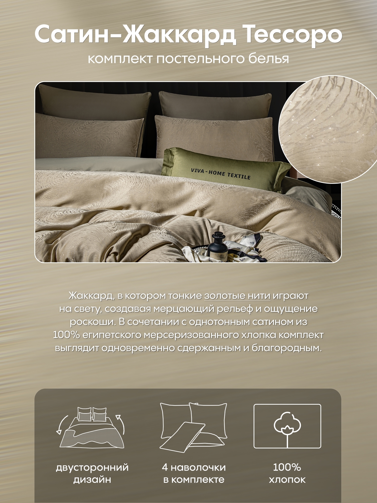 Коллекция “Сатин-Жаккард Тессоро” это воплощение утонченности, где благородные материалы, выразительная фактура и продуманный комфорт сливаются воедино, создавая по-настоящему роскошную атмосферу в спальне.