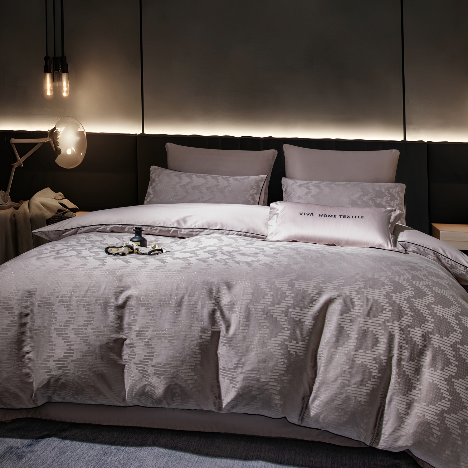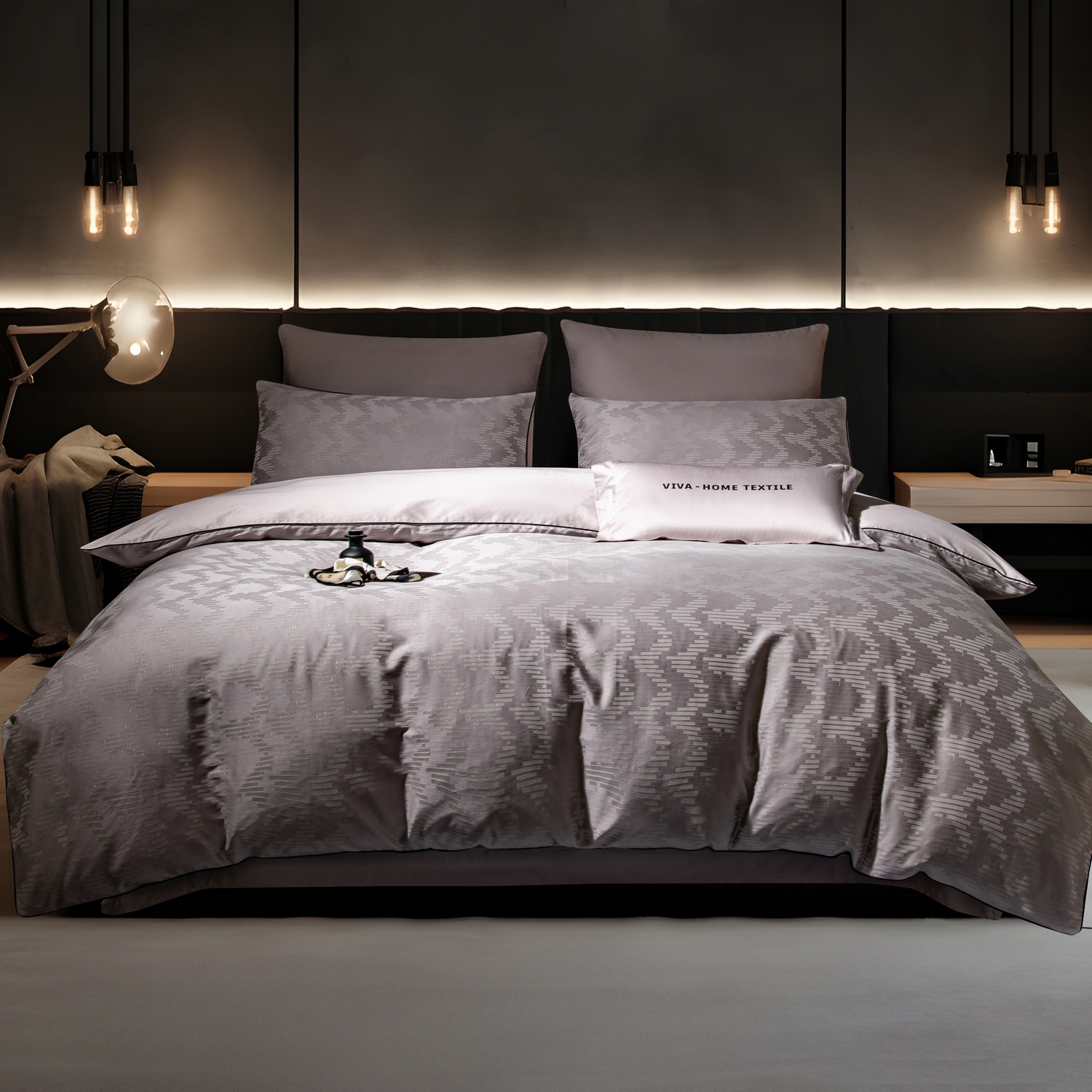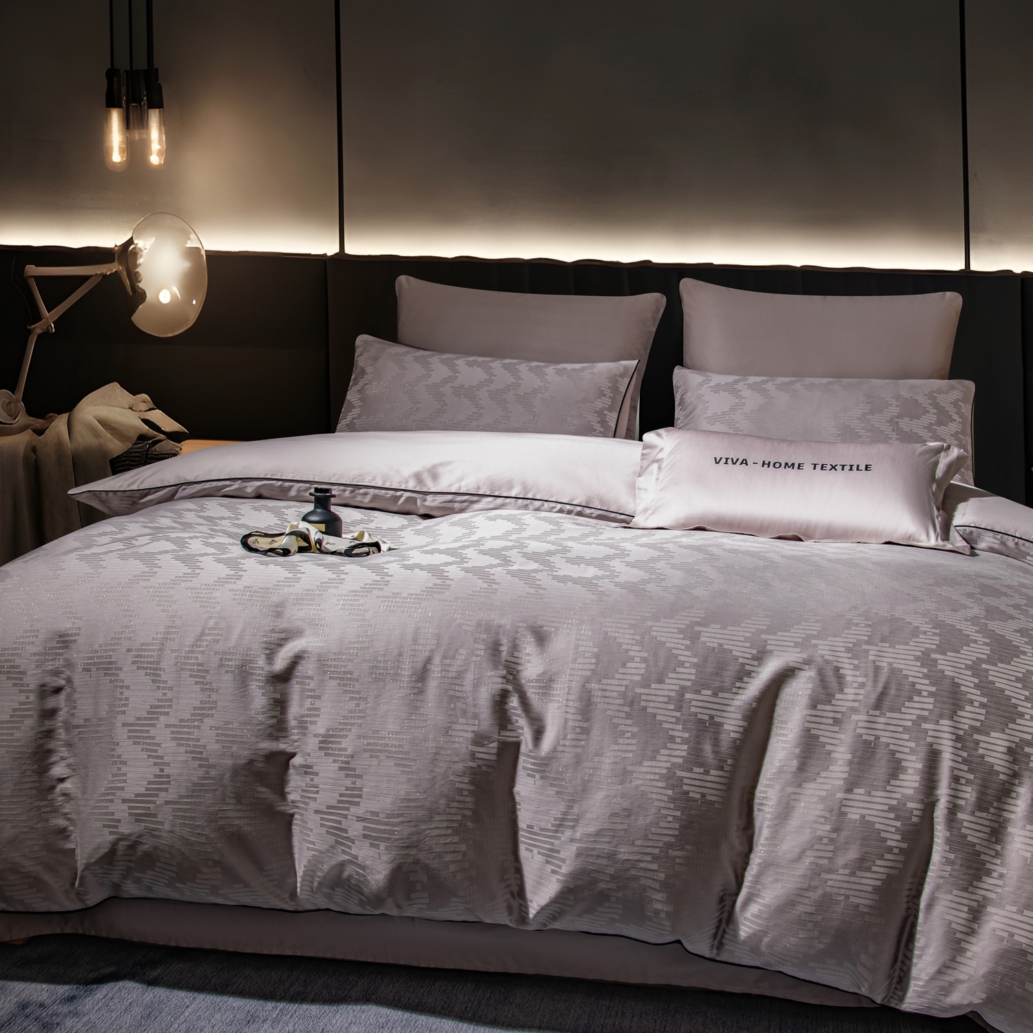 • Пододеяльник: Двусторонний жаккард сверху для эстетики, сатин снизу для максимального тактильного комфорта.