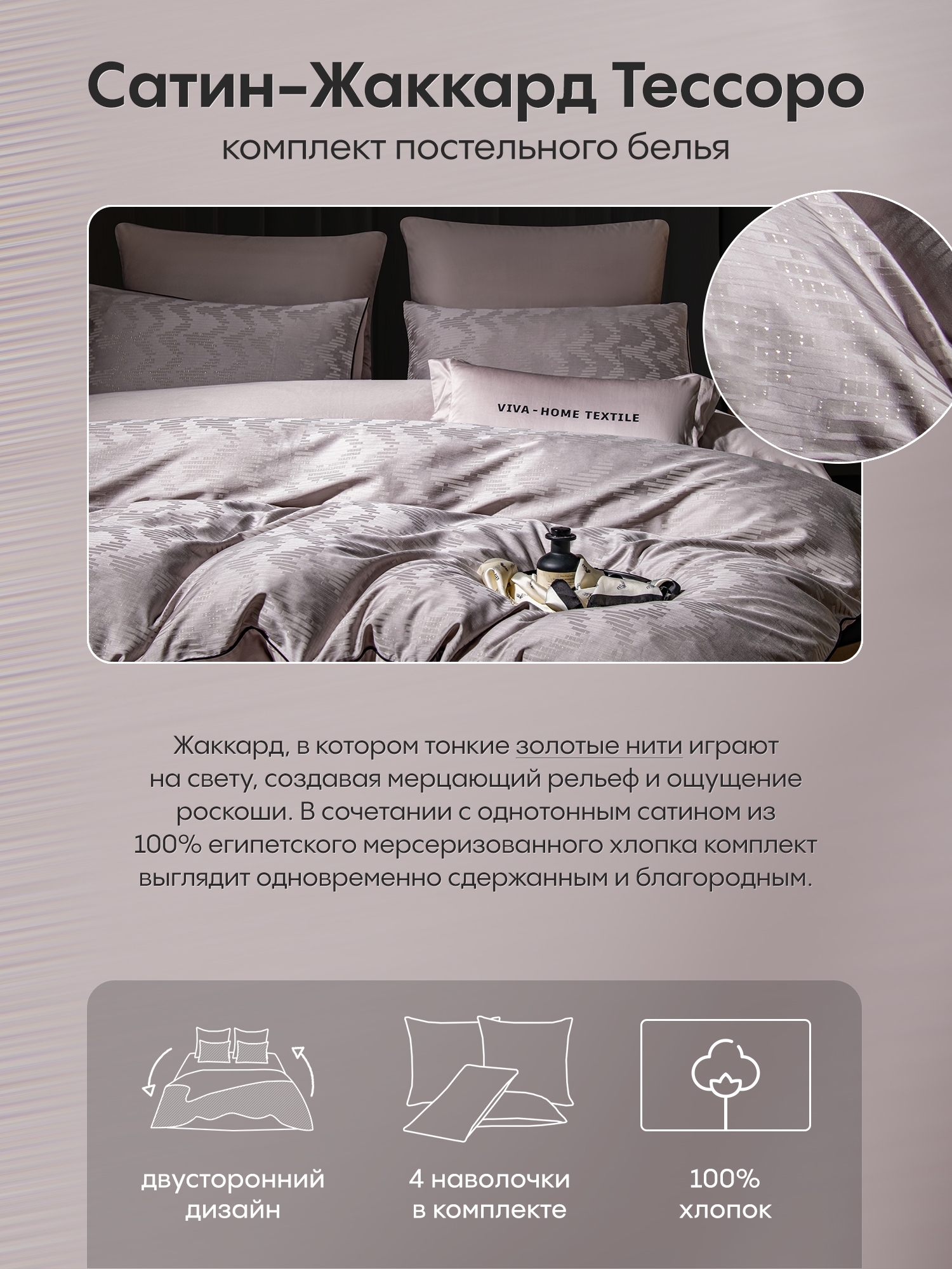 Коллекция “Сатин-Жаккард Тессоро” это воплощение утонченности, где благородные материалы, выразительная фактура и продуманный комфорт сливаются воедино, создавая по-настоящему роскошную атмосферу в спальне.