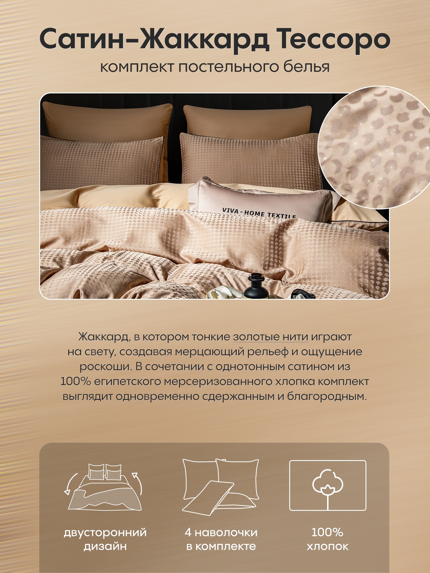 • Наволочки 50x70: Двусторонние роскошный жаккард с золотыми нитями с одной стороны и гладкий сатин с другой.