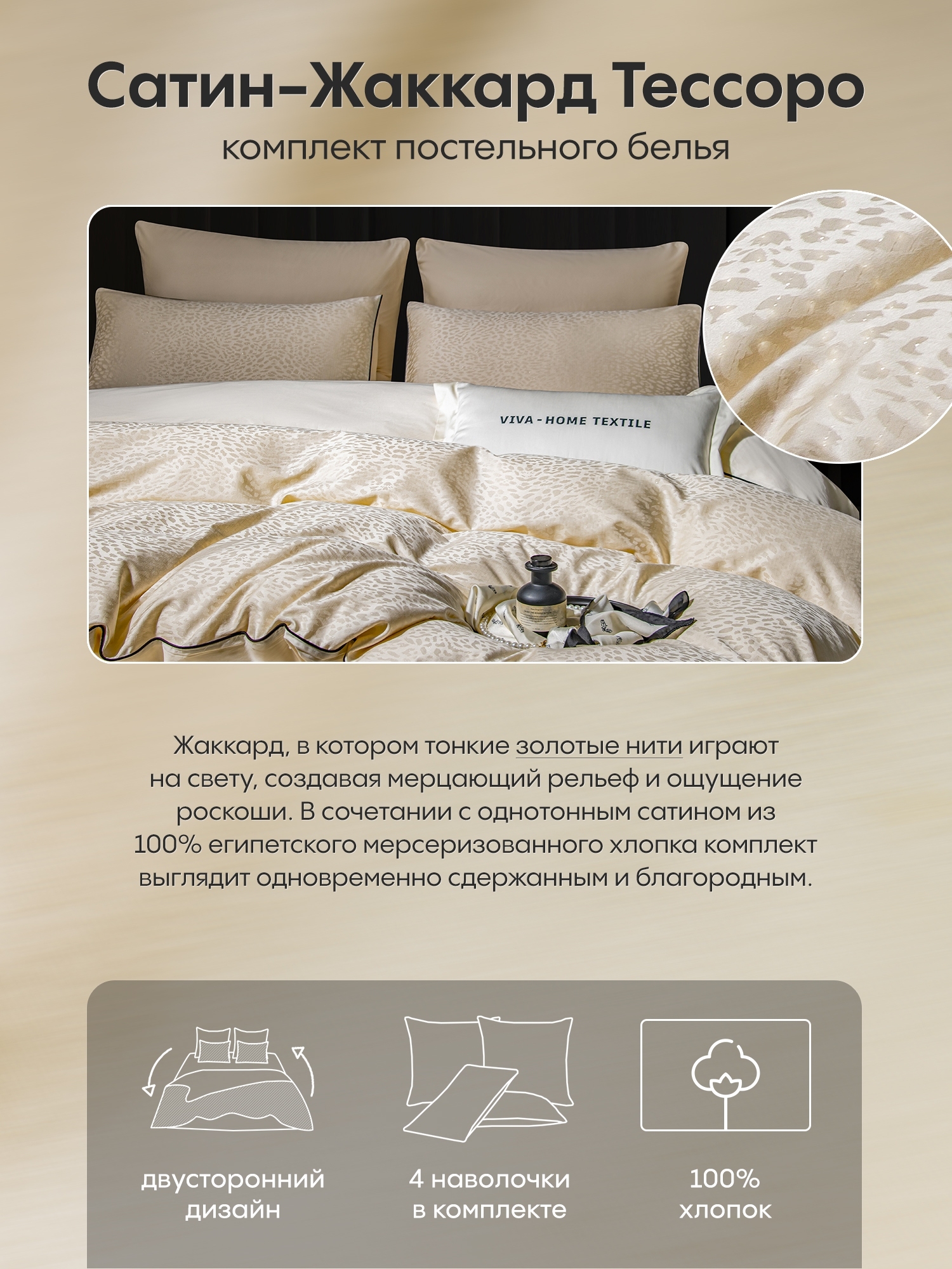 Коллекция “Сатин-Жаккард Тессоро” это воплощение утонченности, где благородные материалы, выразительная фактура и продуманный комфорт сливаются воедино, создавая по-настоящему роскошную атмосферу в спальне.
