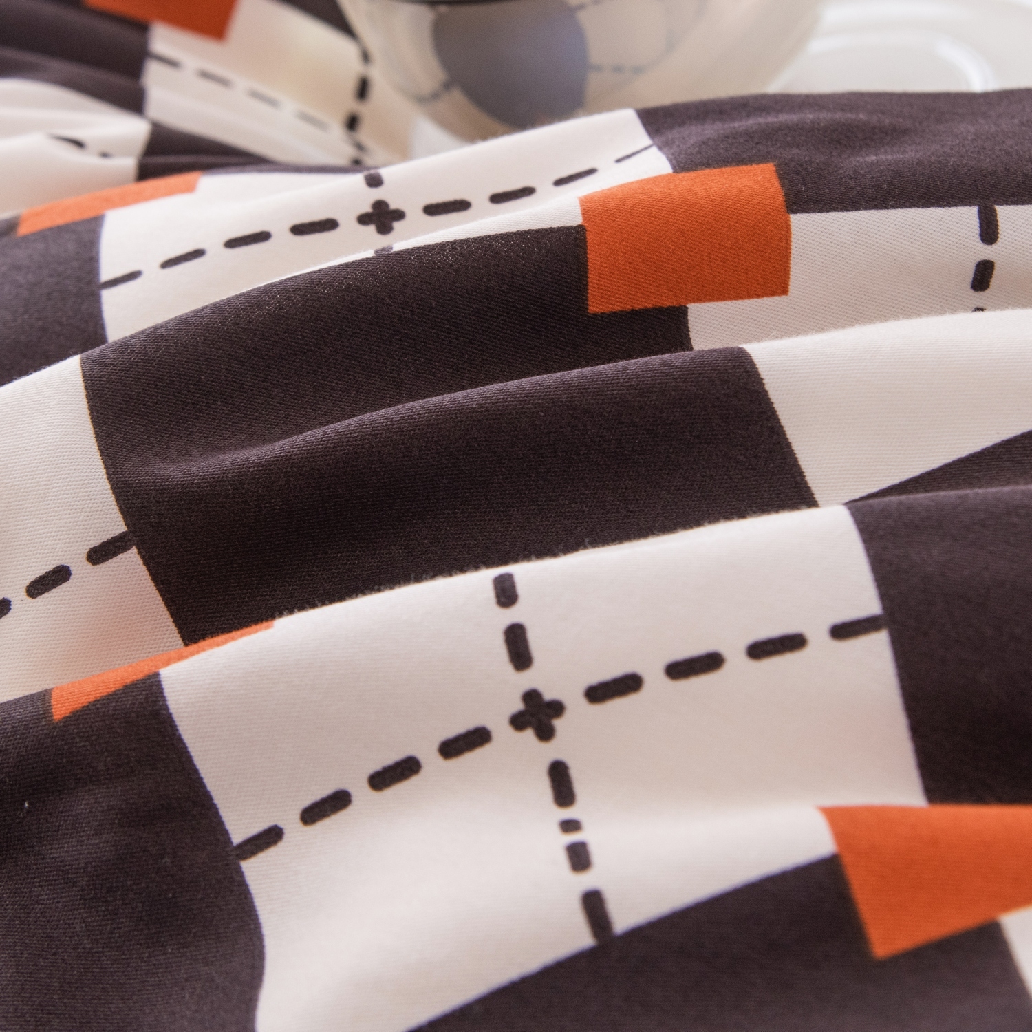 Ткань компаньон: Наволочки с разных сторон разной расцветки, пододеяльник с разных сторон разного цвета, простыня такого же цвета, как низ пододеяльника.