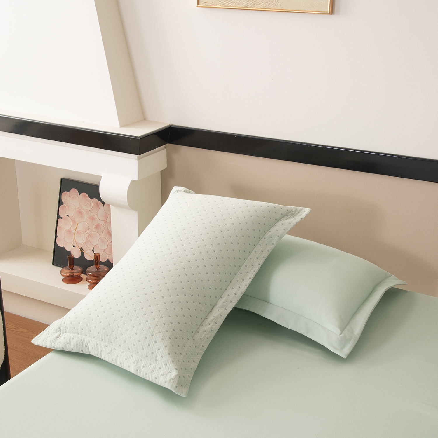 Покрывало из жаккардового муслина с декоративной простёжкой образует утонченный рельефный узор. Ткань отличается мягкостью, лёгким благородным блеском и изысканной текстурой. Дополняет композицию широкий кант в тон простыни, который гармонично объединяет все элементы комплекта.