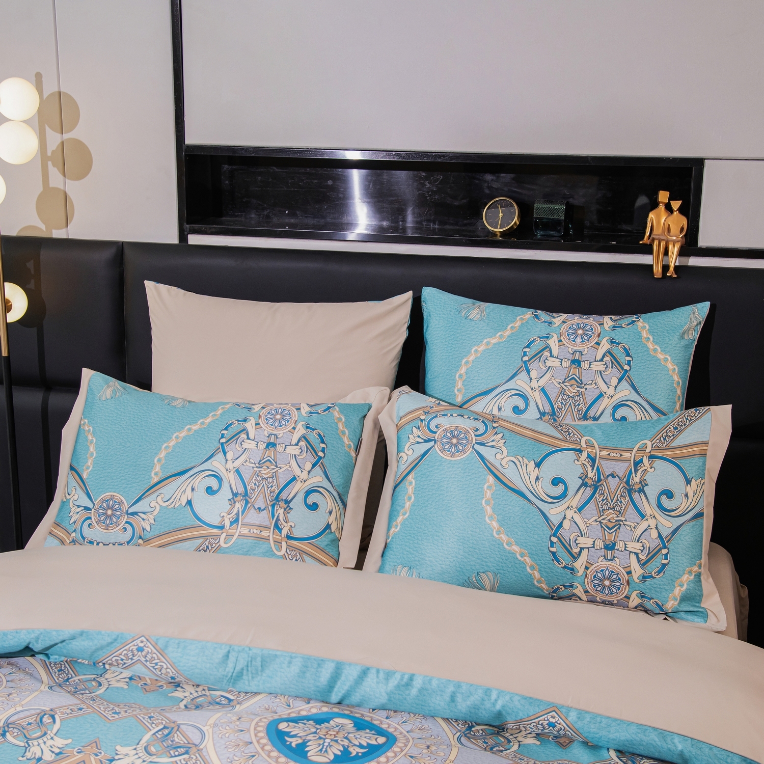 Ткань компаньон: Верх пододеяльника — мерсеризованный сатин, низ пододеяльника — сатин. Наволочки 50*70 см и 70*70 см с разных сторон разной расцветки. Пододеяльник с разных сторон разного цвета. Простыня однотонная такого же цвета, как низ пододеяльника.