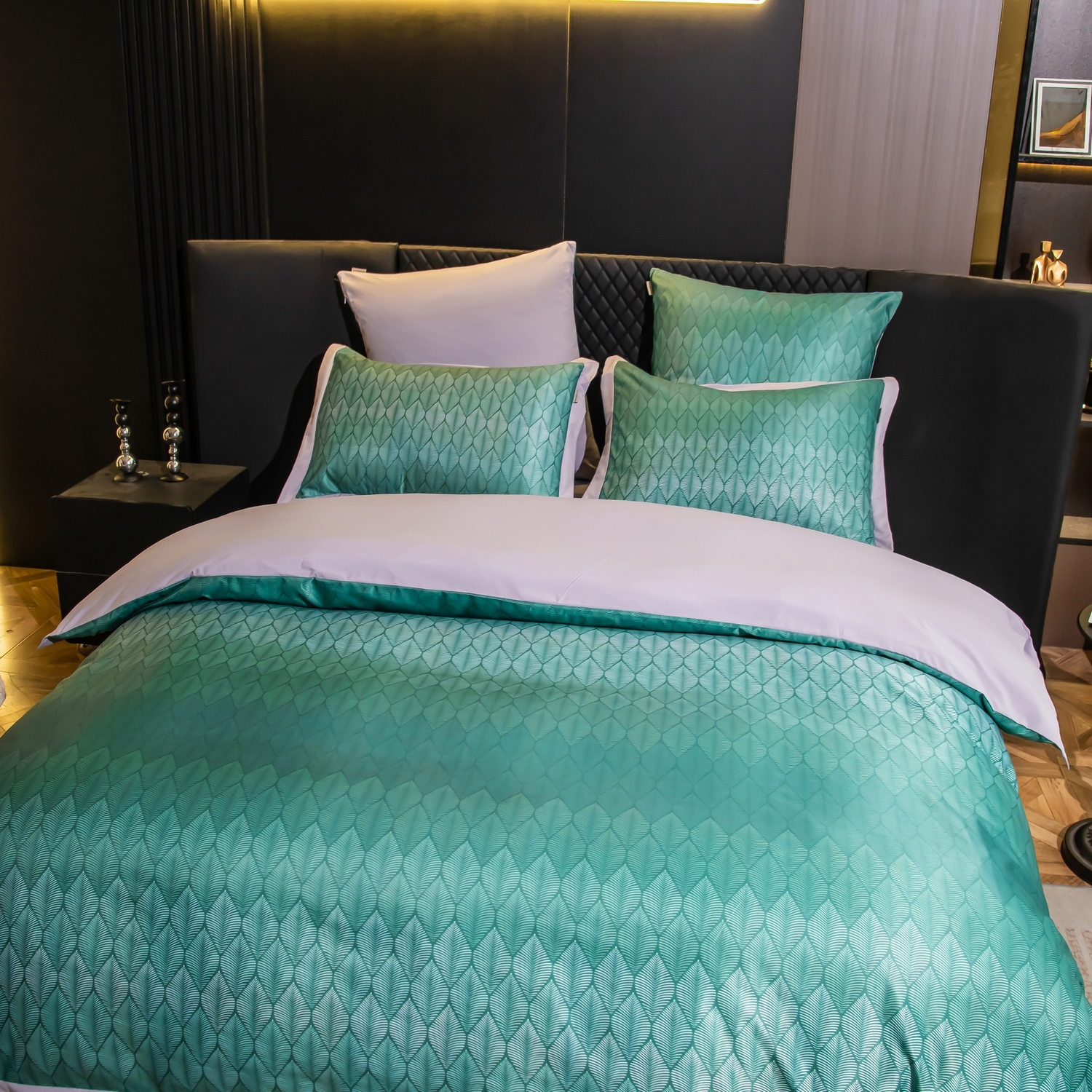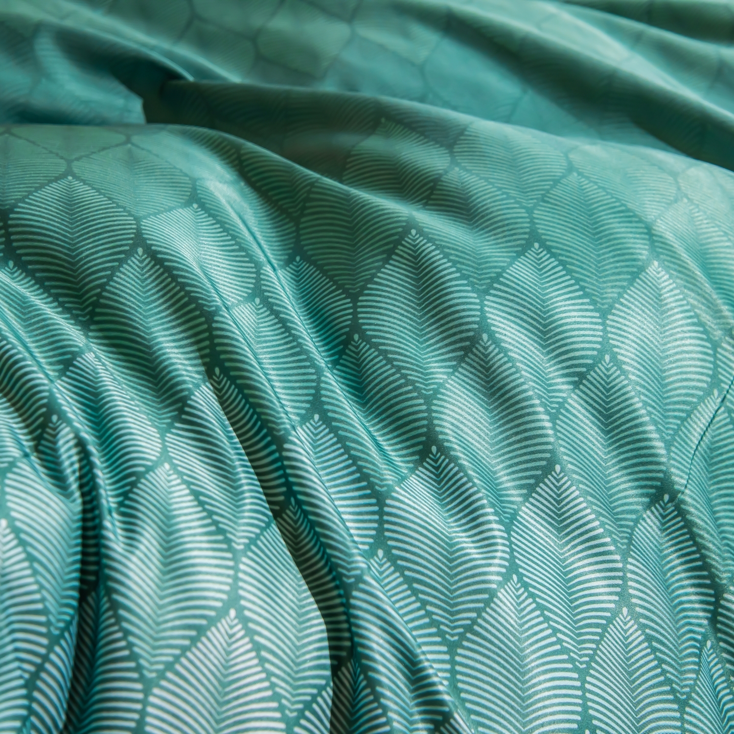 Ткань компаньон: Верх пододеяльника — мерсеризованный сатин, низ пододеяльника — сатин. Наволочки 50*70 см и 70*70 см с разных сторон разной расцветки. Пододеяльник с разных сторон разного цвета. Простыня однотонная такого же цвета, как низ пододеяльника.