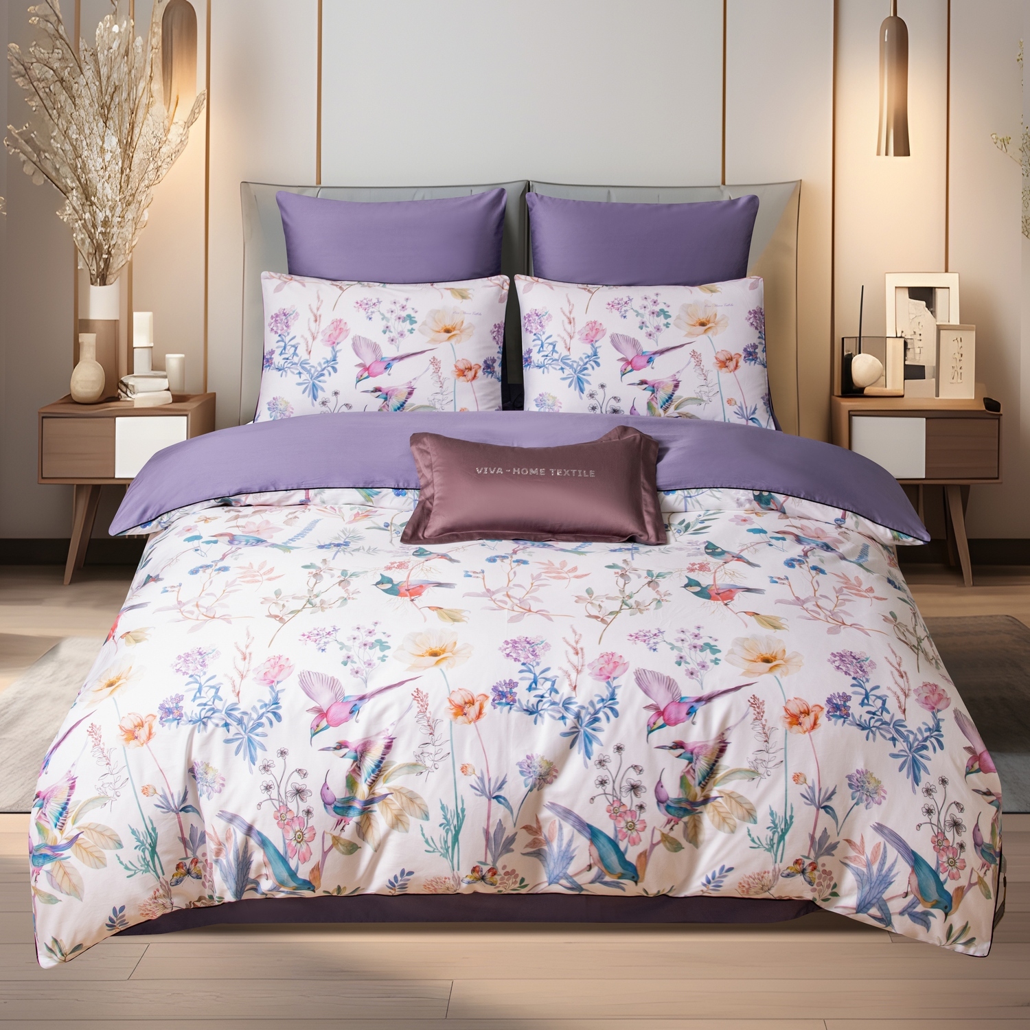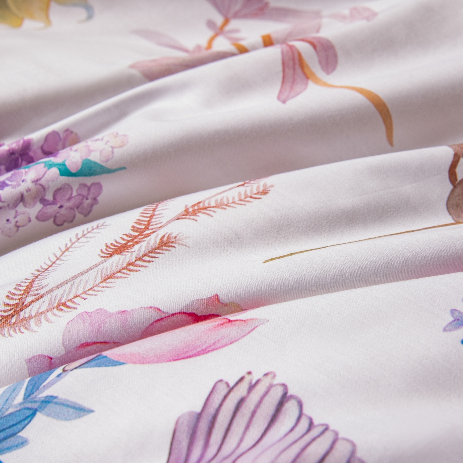 Ткань компаньон: Наволочки 50*70 с разных сторон разной расцветки, наволочки 70*70 однотонные в цвет простыни, пододеяльник с разных сторон разного цвета, простыня однотонная такого же цвета, как низ пододеяльника.