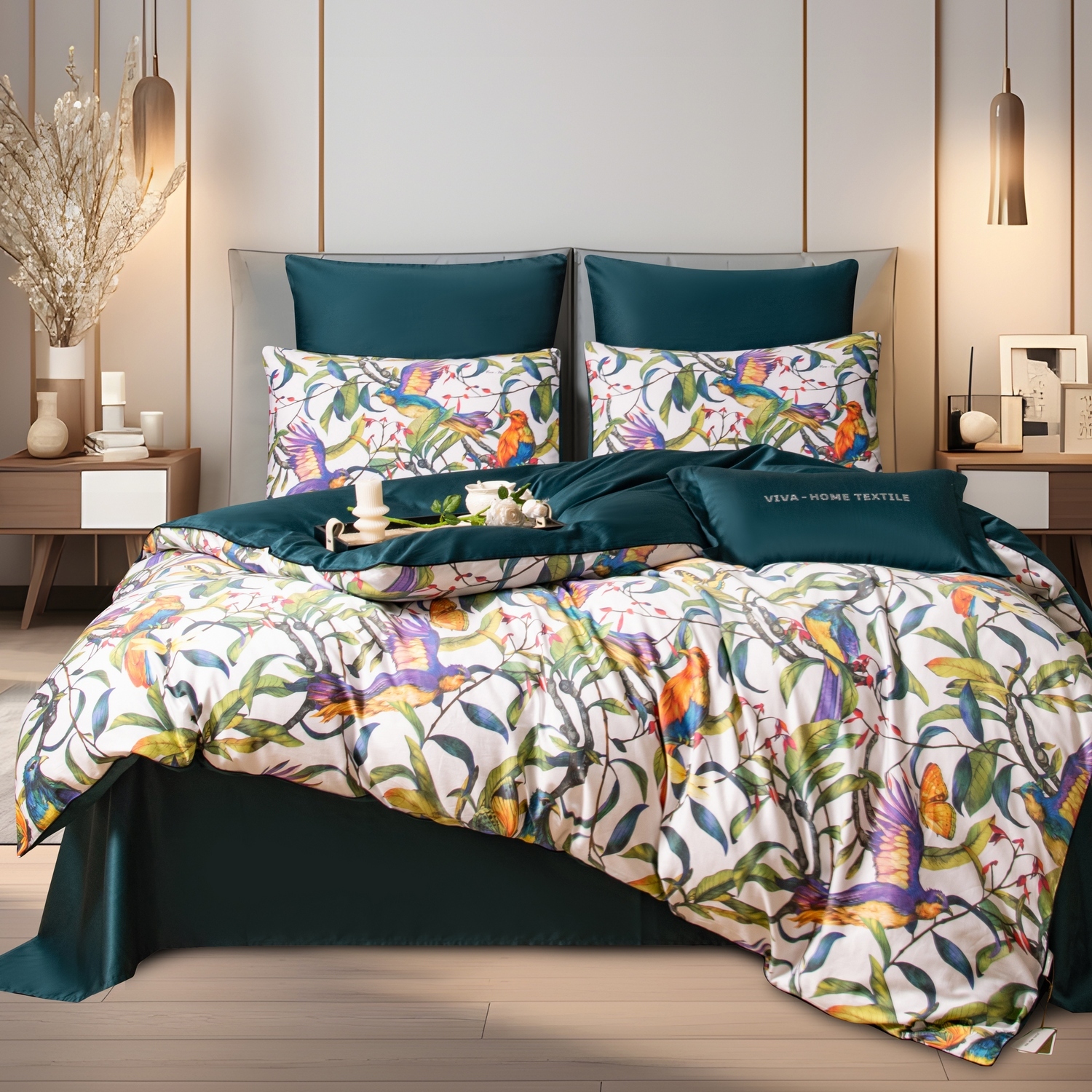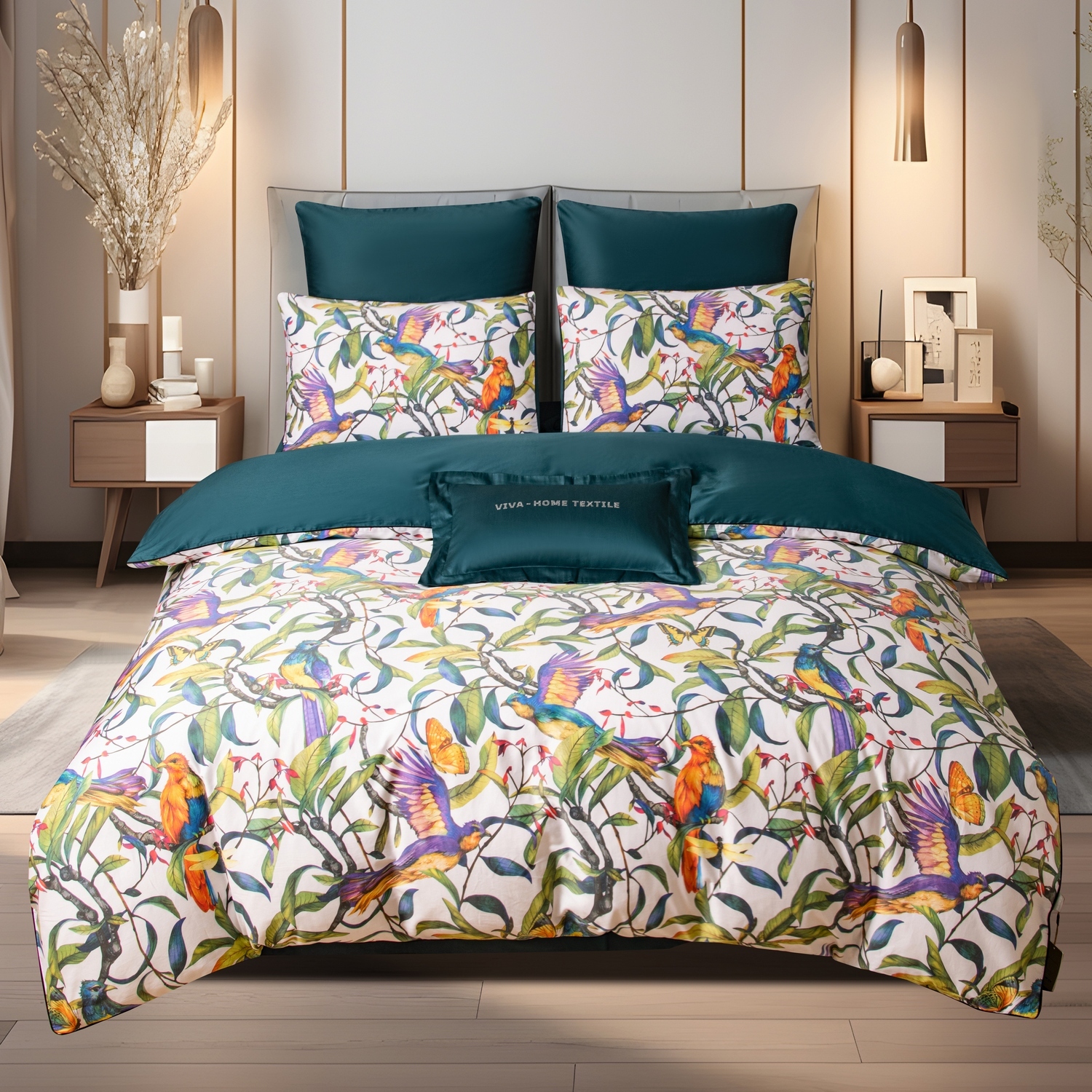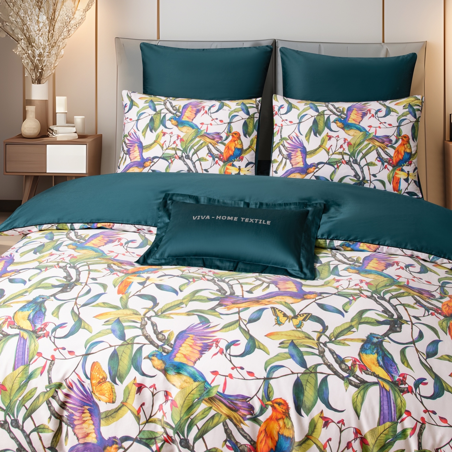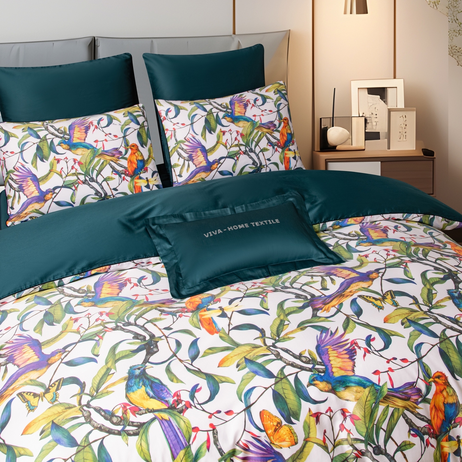 Ткань компаньон: Наволочки 50*70 с разных сторон разной расцветки, наволочки 70*70 однотонные в цвет простыни, пододеяльник с разных сторон разного цвета, простыня однотонная такого же цвета, как низ пододеяльника.