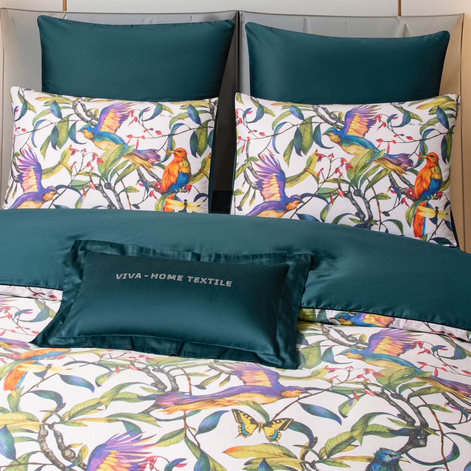 Ткань компаньон: Наволочки 50*70 с разных сторон разной расцветки, наволочки 70*70 однотонные в цвет простыни, пододеяльник с разных сторон разного цвета, простыня однотонная такого же цвета, как низ пододеяльника.