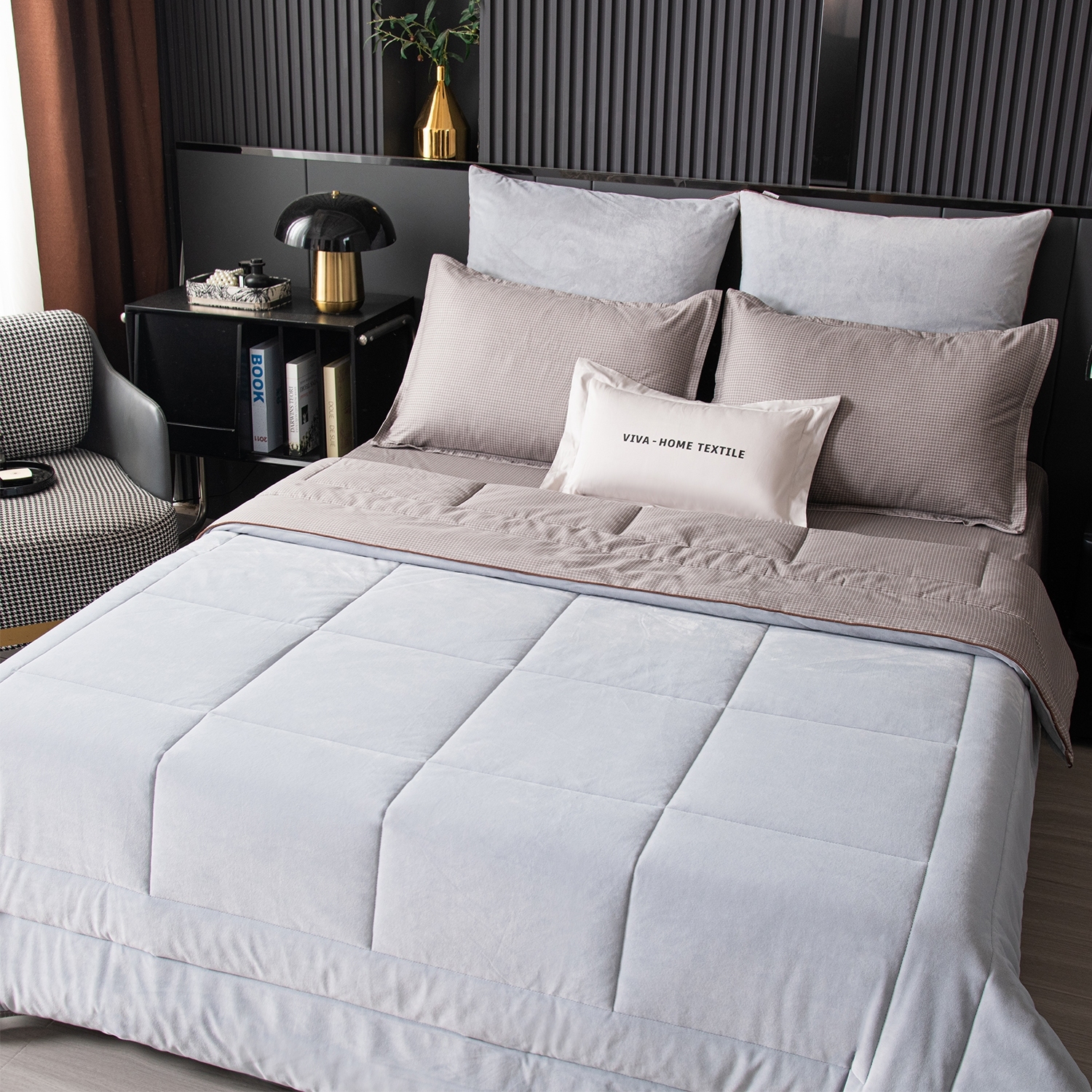 • Элегантность и уют: Одеяло украшено изысканной геометрической стёжкой и бархатным кантом. Верхняя сторона мягкий велюр, придает комплекту благородный вид, а нижняя — 100% хлопковый сатин, отлично пропускает воздух и дарит комфорт во время сна.