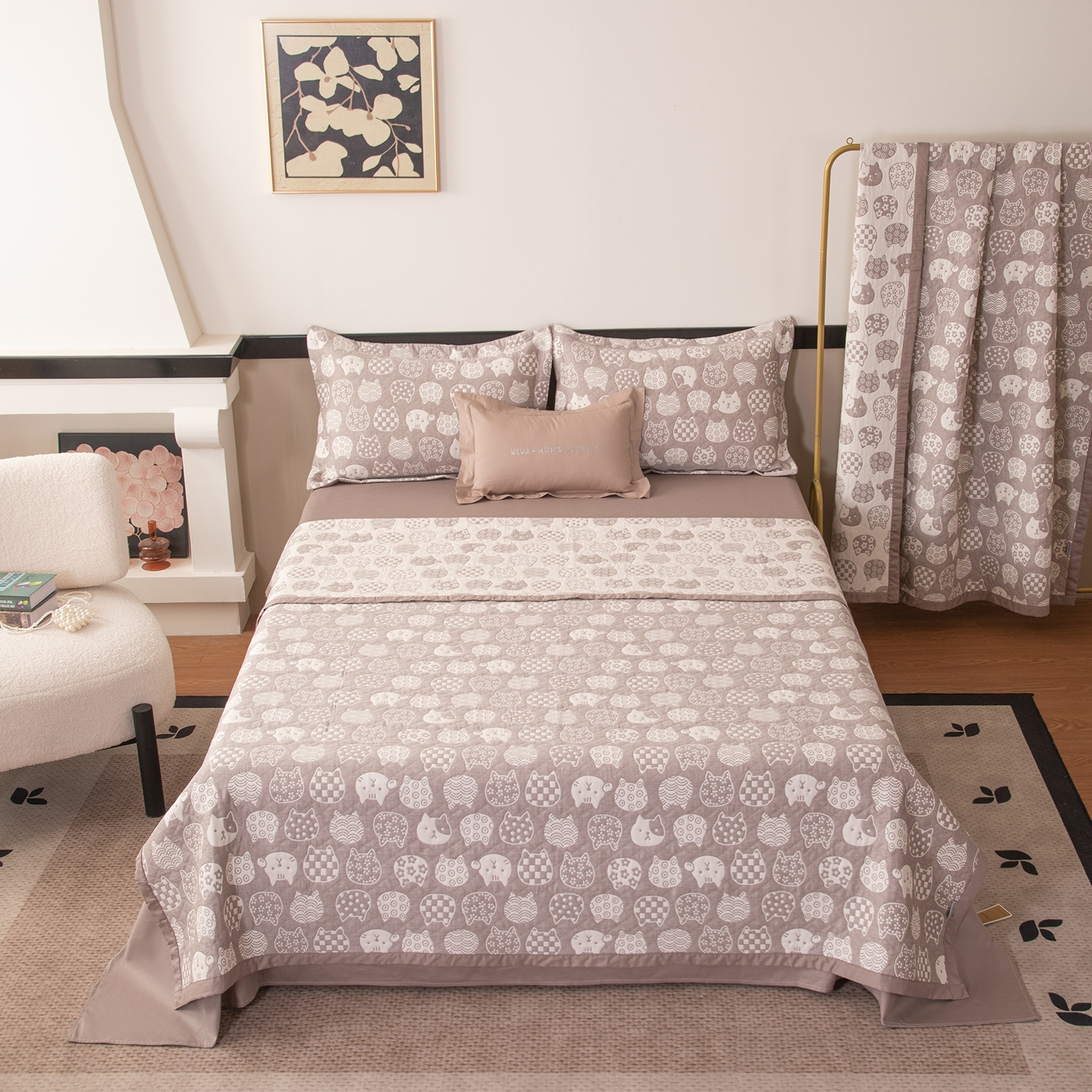 Реверсивный дизайн покрывала с инверсией оттенков позволяет выбрать настроение пространства: на одной стороне - светлый фон с мягким контрастным рисунком, на другой - более тёмный фон со светлым узором. Игра фактур и тонов делает покрывало выразительным акцентом в интерьере и позволяет легко менять облик спальни.