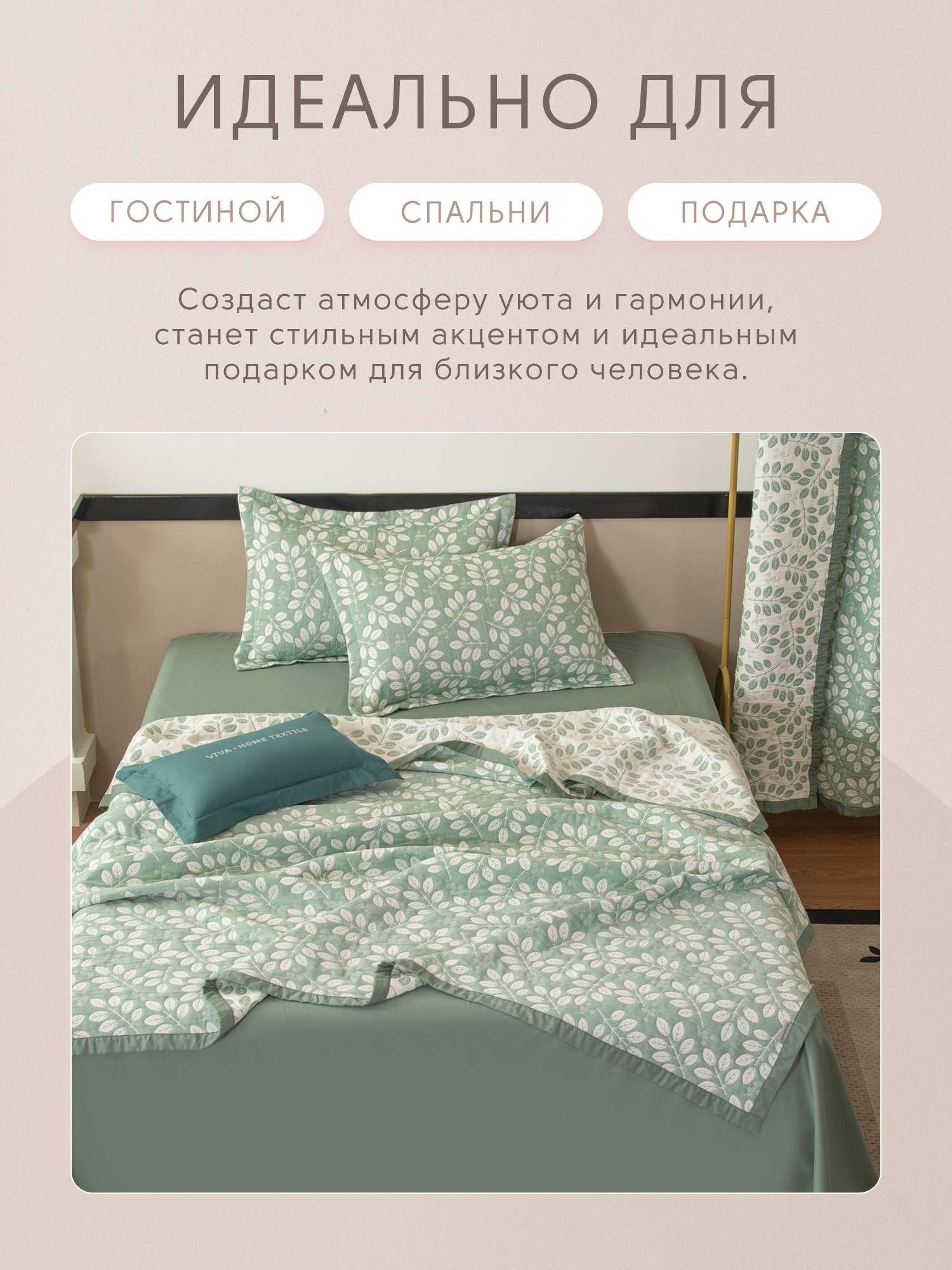 Покрывало выполнено из жаккардового муслина с декоративной простёжкой, формирующей утончённый рельефный узор. Ткань отличается мягкостью, лёгким благородным блеском и изысканной текстурой. Завершает композицию широкий кант, придающий изделию гармоничную завершённость.