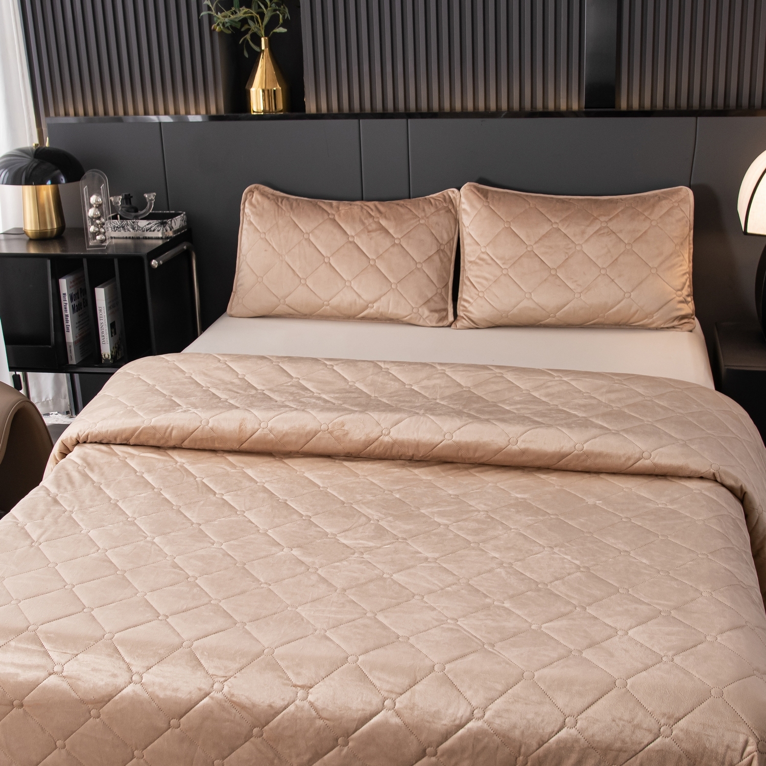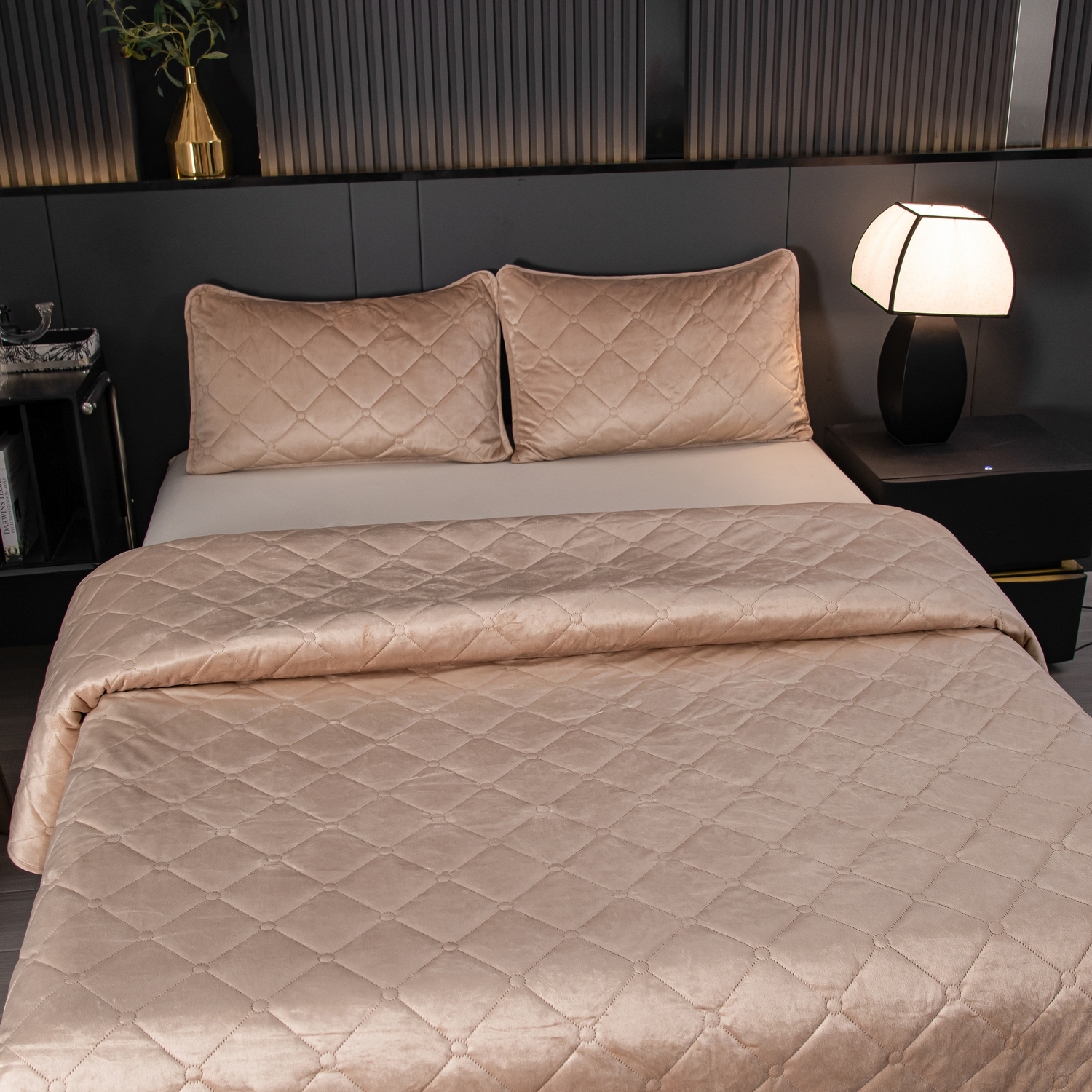 Велюровое покрывало с ромбовидной стежкой: мягкая текстура велюра и приятная цветовая гамма станут прекрасным дополнением интерьера вашей спальни. Кровать с таким покрывалом будет выглядеть стильно и дорого.